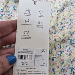 This is a new-with-tags Walter Hagen Clubhouse men's polo shirt in a "Fresco Lemon Sorbet" pattern. The shirt features a vibrant all-over print of lemons and small orange flowers on a white background. It is designed for performance and comfort, with features including moisture-wicking, 4-way stretch, breathability, and wrinkle resistance. The fabric also offers UPF 30+ sun protection. The material is a blend of 80% polyester, 15% cotton, and 5% spandex. It is a men's size small