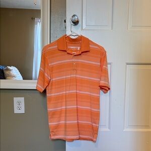 Bright orange Walter Hagen polo shirt with subtle white stripes and white buttons. Ideal for casual wear and for golf