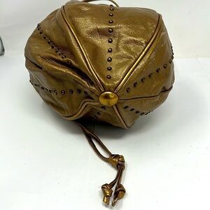 Single drawstring adjustable strap. Metal studs. Leather covered button at the bottom pinnacle. Nylon lined interior. Minor scuffs and water marks, that are mostly unnoticeable. No odors. Made in Italy.