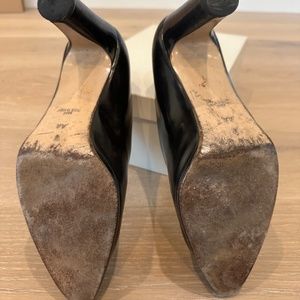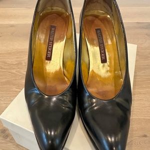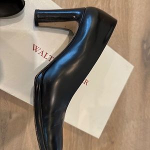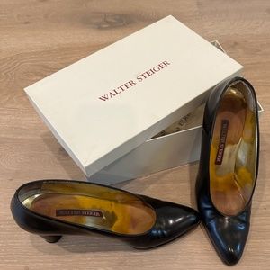 Walter Steiger black leather high-heeled pumps. Blocky, round heel. Used. Shows some wear, but overall in very good condition. No major marks/scratches/gouges in leather. Comes with original box. Originally purchased from Neiman Marcus - original price $235.00. Size 8 AA.