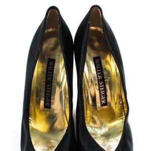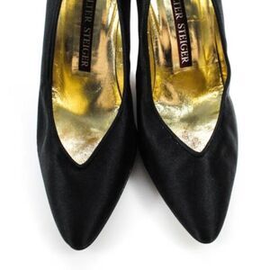 Nice pair of Walter Steiger black, satin, pointed to pumps. Total length: 10" Heel: 4"
