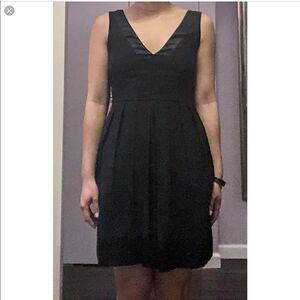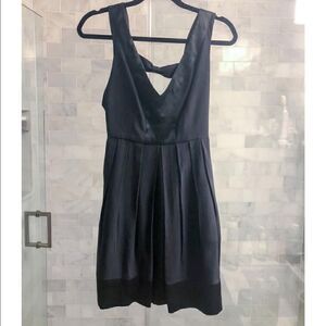 Walter, Black Size 2 dress, Silk, pleated front, full skirt, v neck, hem satin border detail, ladder back, bows details, sleeveless party dress, side zipper closure, lined. 34” bust, 34” long, Great for Prom, Cocktail, Wedding, Night, Evening, femenine, Sexy.