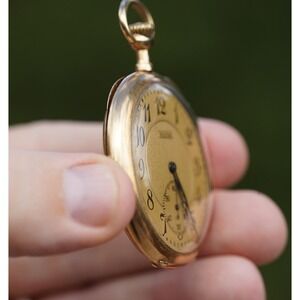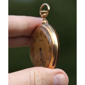 Condition:A very fine quality, antique, American-made pocket watch. The 14k gold case has a nice rosy tone and is in excellent condition for its age. The acrylic crystal is almost perfect. The movement winds, sets, and runs smoothly and continues to keep accurate time.