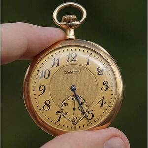 Here we have a magnificent antique pocket watch made in the United States by the American Waltham Watch Co. circa 1907. It features Waltham's "Royal" grade, "Colonial" model, stem winding and setting, 17 jewel movement that still keeps excellent time. The solid 14k rose gold open face case was made by Waltham's own case manufacturing division and features a simple polished finish for its bezel and rear cover. The acrylic crystal is almost perfect. However, the movement still winds, sets, and runs smoothly. Enjoy!