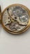 Vintage Waltham pocket watch movement with intricate gears. Features a gold and silver color scheme. 12s Grade 239. 17 jewel 1929. 14K gold filled case. Working condition. Glass dial cover.