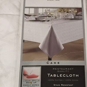New in package 70 in round stain resistant restaurant quality fabric tablecloth. 100% cotton. Machine washable. Cane style by Wamsutta. Seats 4-6, fits table size 46-58 in. White fabric with subtle diamond crisscross pattern. This tablecloth is new in package, although poorly folded. Does not appear to have been used. Price tag residue on packaging. (See photos). Smoke and pet free home.