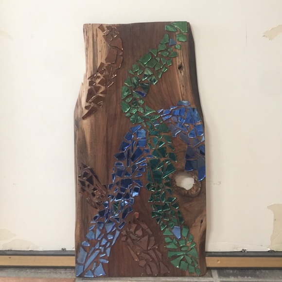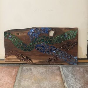 This is a piece of old oak, that has been sanded down to show the layers of the wood. On top of it is specialized glass call German new antique. The glass allows you to see a faint image of yourself, perfect to hang up in the hallway or to even use as a center piece!