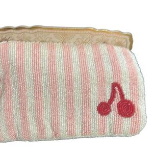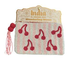 This wristlet features a Red striped design with cherry seed bead accents, offering a whimsical and playful style. Crafted in India, it has a beaded exterior and a 100% polyester lining. The wristlet measures 7.75 inches in length and 5 inches in width, making it a fashionable accessory for women. The item is new with tags.