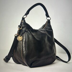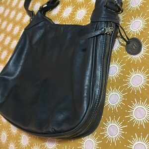 Sleek butter soft black leather hobo crossbody purse made by Wanderers Travel Co. called Santorini. The zipper on the outside unzips to extend the bottom and sides of purse. Interior has a zippered pocket and two open pockets. Well made and Measures: 14” x 12” x 3-6”. Great preowned condition no stains. The leather has been conditioned and is butter soft.