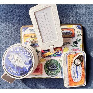 Made by Wandering Moon, the set includes a zipper pouch and two luggage tags featuring playful designs of sardine and mackerel cans - complete with pop-top.