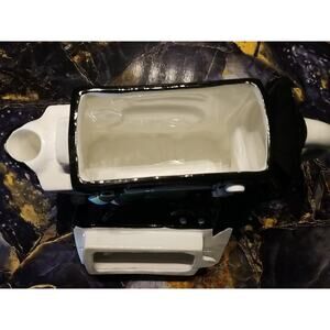 The Wangs Sewing Machine Teapot is a medium-sized ceramic teapot shaped like a sewing machine, featuring a multicolor design with hand-painted details. This designer piece includes a lid and is adorned with a seamstress theme. With a painted finish and crafted in China, this teapot adds a unique and charming touch to any kitchen or collectibles display. Its size of approximately 8” in length, 9” in width, and 5.5” in height makes it a distinctive and delightful addition to any tea set collection.