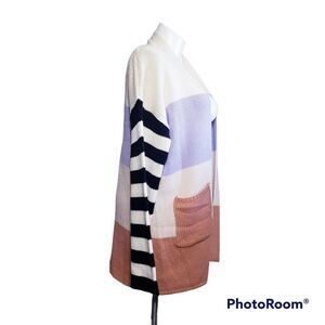Wanna b color block striped sleeves open front cardigan with pockets 22" pit-pit 34" long in excellent condition
