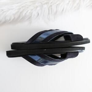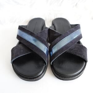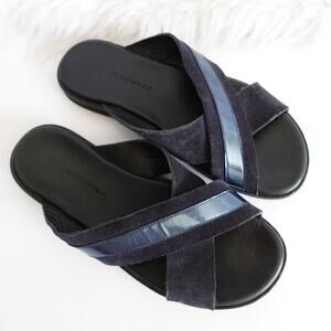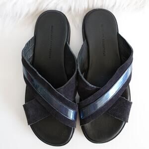 Want Les Essentials Kavala Crossover Flat Sandal Flip Flops in Blue Metallic Vinyl and Navy Suede
