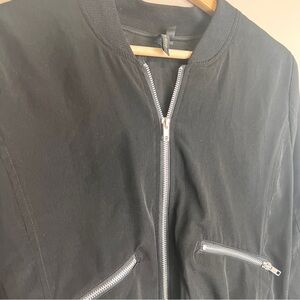 Elevate your style with this elegant black bomber jacket featuring sleek silver zipper accents. Perfect for a chic and modern look. Excellent pre-loved condition, no flaws.