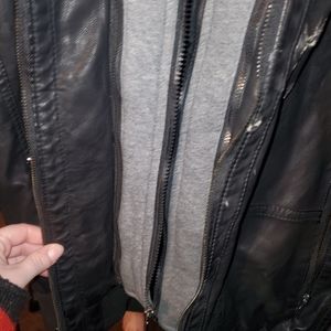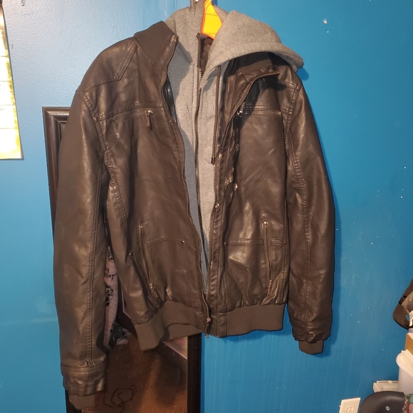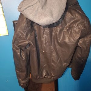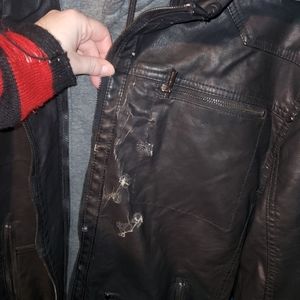 was stored improperly as you can tell in the photos but still a great jacket has that worn look too it a detachable hood and a warm jacket for the winter time .