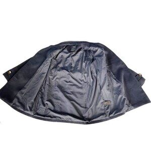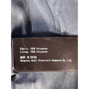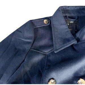 Wantdo Pea Coat Double Breasted Winter Trench Jacket in navy blue. Jacket buttons down the front and has a belted waist to cinch you in. It's made of 100% polyester with a poly lining and is a woman's size XL.