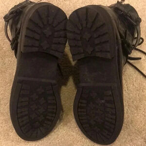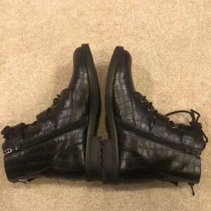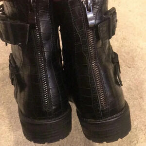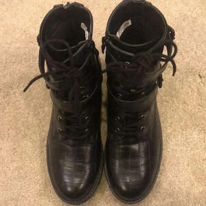 Seldom worn, side and back zippers, cute double buckles and shoe string tie up. Leather look, quilted styling.
