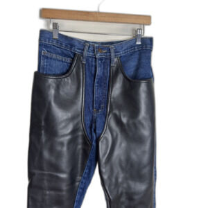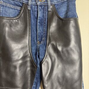 Unique hybrid denim: classic blue jeans with black faux leather panels on the front for a bold, western-inspired look