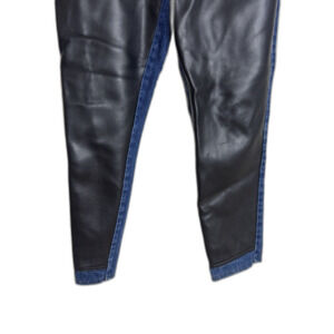 Contrast black faux leather paneling on front legs, back is all blue denim