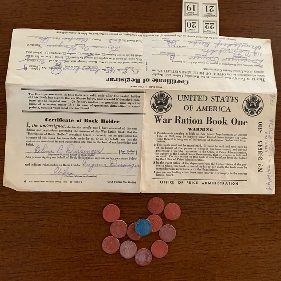 War Ration Book one. From July 24, 1942. Several coupons still intact along with tokens. Great authentic piece of history. Shows who it was issued to and registrar.