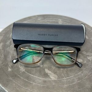 Chic Warby Parker eyewear with black and gold frames. Includes a stylish case.