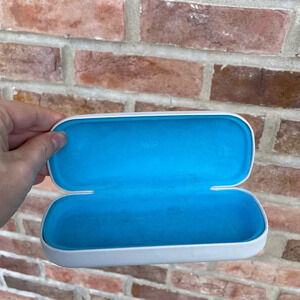 Light grey hard clamshell glasses cases. Interior is velvety turquoise textile. Good used condition. Please see pictures for details on wear and condition.