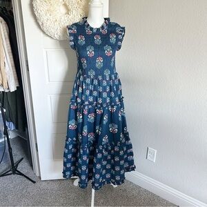 Ward Smocked Block Print Midi Dress Mud Pie Size S Navy