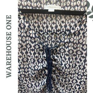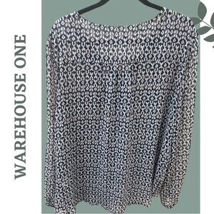 Warehouse One blue, white and pink patterned lightweight blouse. Sleeve has an elastic cuff, lace up detail at neck. Excellent condition