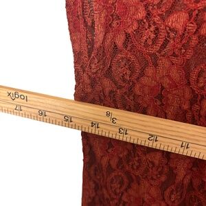 Romantic and sultry sheer lace midi dress in deep red by Warehouse. Features a floral lace overlay (unlined), soft cap sleeves, elastic waist, and dual side slits near the ankles for movement. Layer it over a slip, bodysuit, or bralette for a bold, feminine look.