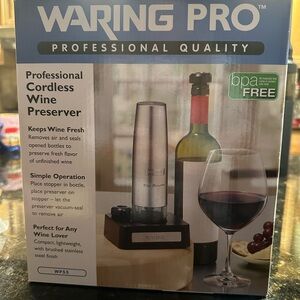 Cordless Wine Preserver by Waring. No wine is wasted with the Waring Wine Preserver. It removes air and seals unfinished bottles to preserve the taste and bouquet for your continued enjoyment.