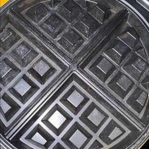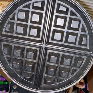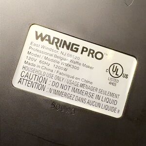 Waring silver waffle maker with black handle. Sleek design for perfect waffles.