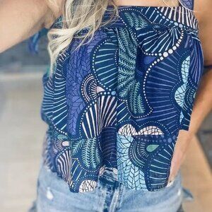 Gorgeous boho-chic crop top from Warm, featuring a purple and blue floral print with a swingy, layered silhouette. The tie straps ensure a customizable fit, while the lightweight 100% cotton fabric makes it perfect for vacation, resort wear, or effortless everyday style. No flaws, but has been washed and slightly faded.