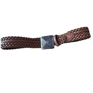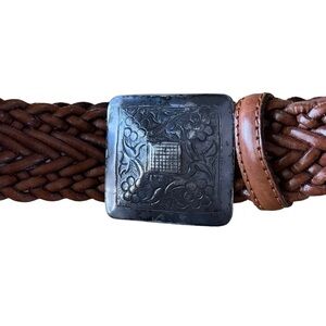 Warm Brown Woven Leather Belt with Large Square Buckle Size Small
