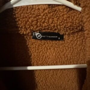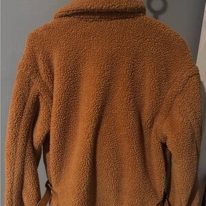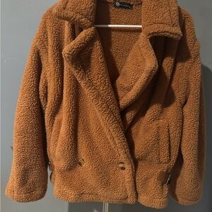 Embrace the cozy warmth of this plush teddy jacket, featuring a rich caramel hue and a relaxed, oversized fit. The wide lapels and soft sherpa texture make it a stylish choice for chilly days. Its full-length sleeves and fold-over collar add to the comfort and charm.