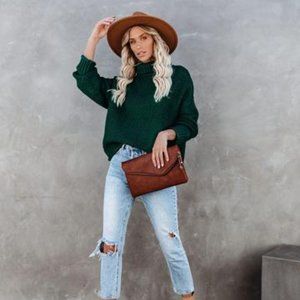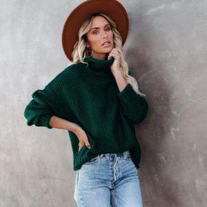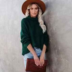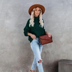 Our Warm Embrace Emerald Green Turtleneck Sweater offers an effortless layer of chicness in a beautiful emerald green knit. Fitting relaxed with a subtly oversized body, Turtle neckline and drop shoulder long sleeves. A high-low side split hem makes it perfect for a cute front tuck into denim or leggings!