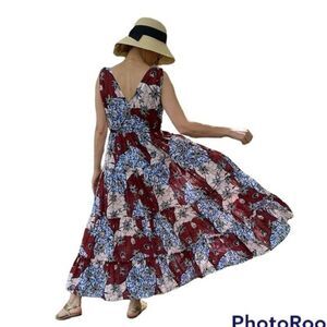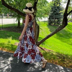 Luxe cotton printed dress. Open neckline at front and back. sleeveless with ties and ruching at shoulders. Tiered throughout.