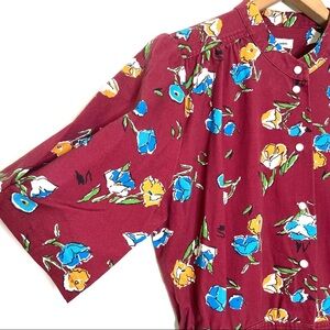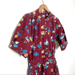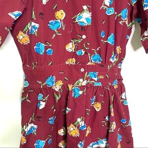 Excellent condition! Mid-weight, non-stretch canvas. Gathered waist. Floral print. Round collar. long sleeves with snap cuffs. Partial snap placket and waist tie. On-seam hip pockets.