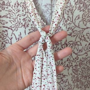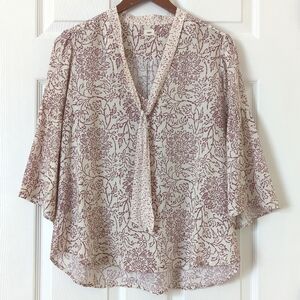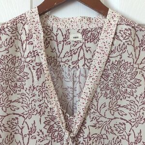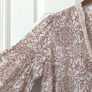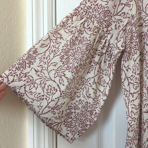 This beautiful top features a v-neck with a tie detail, quarter length bell sleeves, and a curved hem. It is cream with a burgundy floral print. It has an oversized, relaxed fit that is very lightweight, soft and comfortable. Perfect to pair with dark wash flared jeans for a casual bohemian boho chic look! A stunning piece for Spring and Summer! High quality!