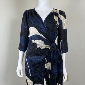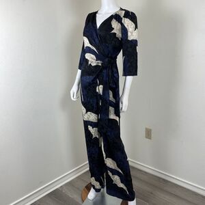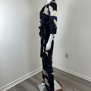 Warm NY Womens Size S Blue Silk Jacquard Floral Wide Leg Jumpsuit Contemporary