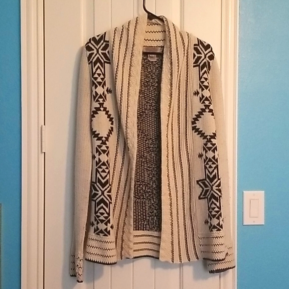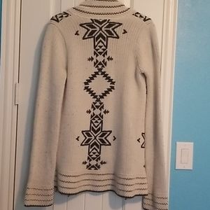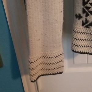 White Sweater with Black Native Design on the front and back. Gently frayed, other fabric sticks too it. Great condition.