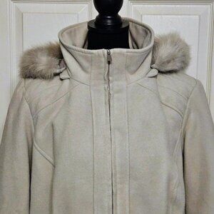 Warm Winter Coat with mock collar, hood with fur-like edge. It zips up all the way to your chin.