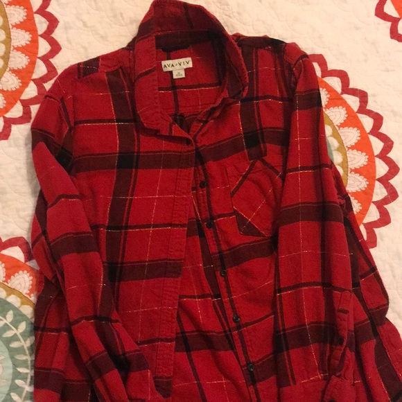 Super cozy red and black with gold stripes flannel! Perfect with jeans and leggings! Looks great by a cozy fireplace!