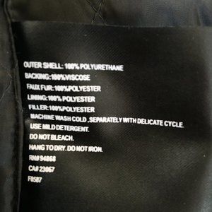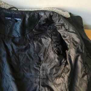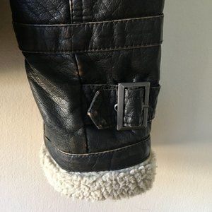 Dark brown aviator / bomber jacket with sherpa collar and cuffs. Zip close, and interior flap has sherpa lining to keep out drafts! Zippers on pockets too. Cuffs can be rolled up or down, functional buckles on sleeves. Leather-like material, machine washable. Silky quilted interior. Very warm. Timeless cool. :)