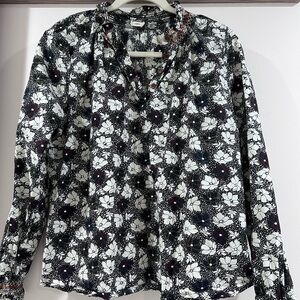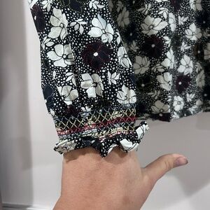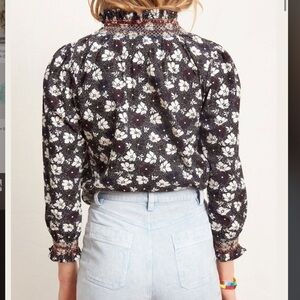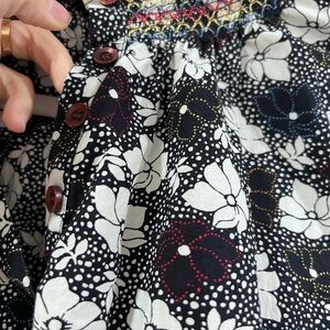 Luxe cotton blouse in plumeria print. Button placket at front. Rainbow embroidered smocking at neck and cuff.