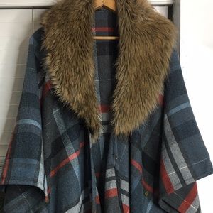 Warm plaid poncho with faux fur stole