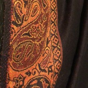 Pink, red, orange, and black Pashmina scarf with detailed floral paisley edges and border. Excellent quality and condition! Reverse side is striped. Very soft and intricate. Perfect for keeping warm on cool festie nights.