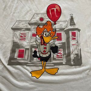 Warner Brothers WB100 Looney Tunes T Shirt. Graphic features Daffy Duck x IT Pennywise Clown Crossover. Size Adult Extra Small / Youth Large