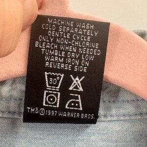 This medium-sized chambray button-up shirt features a detailed embroidered design of classic Looney Tunes characters on the back. A casual yet stylish collector's piece.