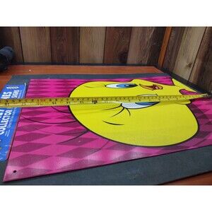 This vintage metal tin wall hanging sign features the beloved Looney Tunes character, Tweety Bird, from Warner Bros. Animation. The colorful design and decorative features make it a great addition to any collection or a unique piece to hang in any room. The sign is made in the United States and is perfect for fans of the classic animation franchise. It is not signed and does not come with any custom bundles.