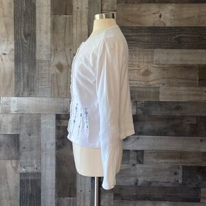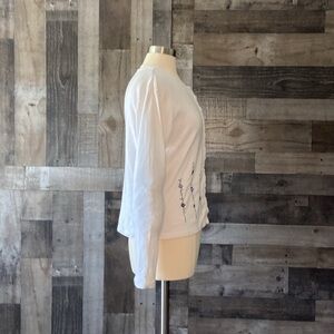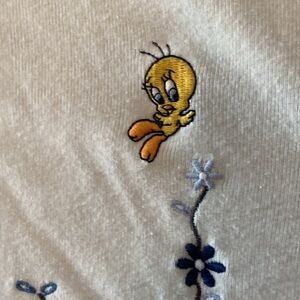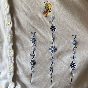 This Warner Bros Studio Store cardigan is white. If offers floral vines embroidery and tweety bird on the left side. It is gently worn and is in excellent condition!